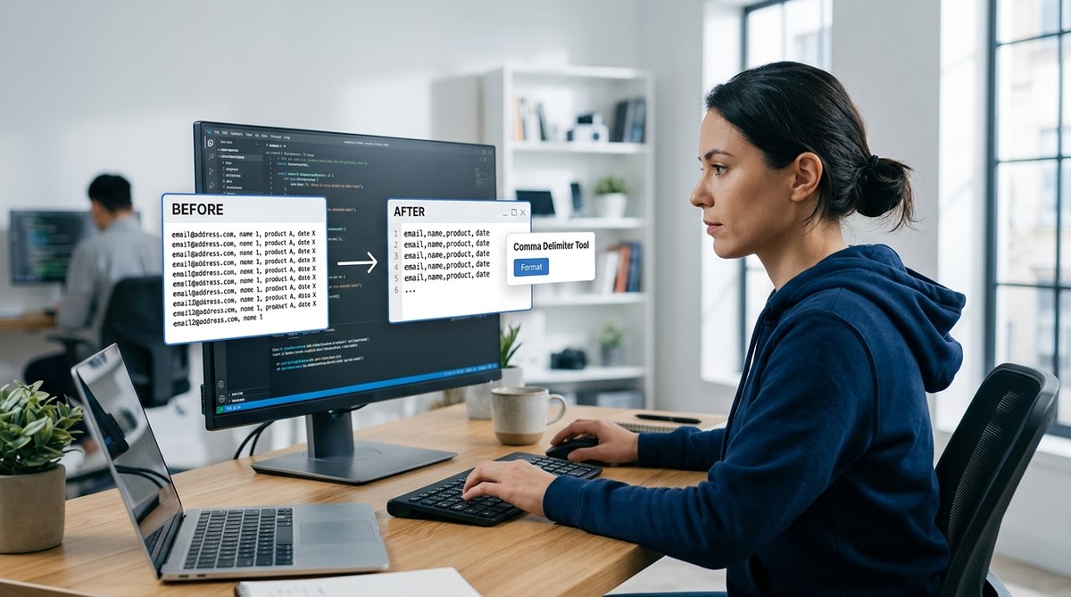 A browser-based comma delimiter tool handles these tasks in seconds. No installation, no configuration, no fighting with auto-formatting.